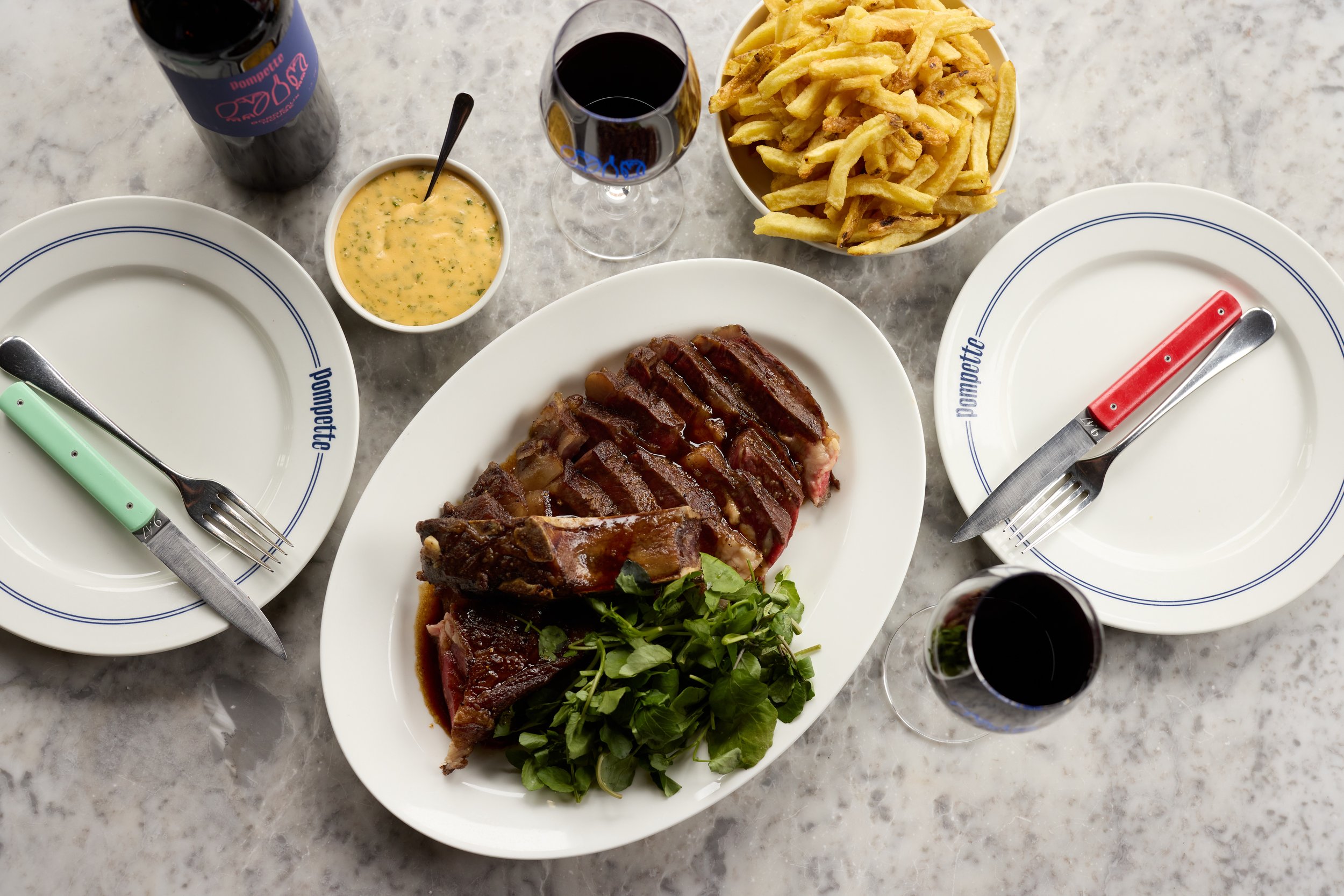 A mighty onglet steak, dressed in a meaty jus de viande, served with watercress, frites and a glass of House wine.
